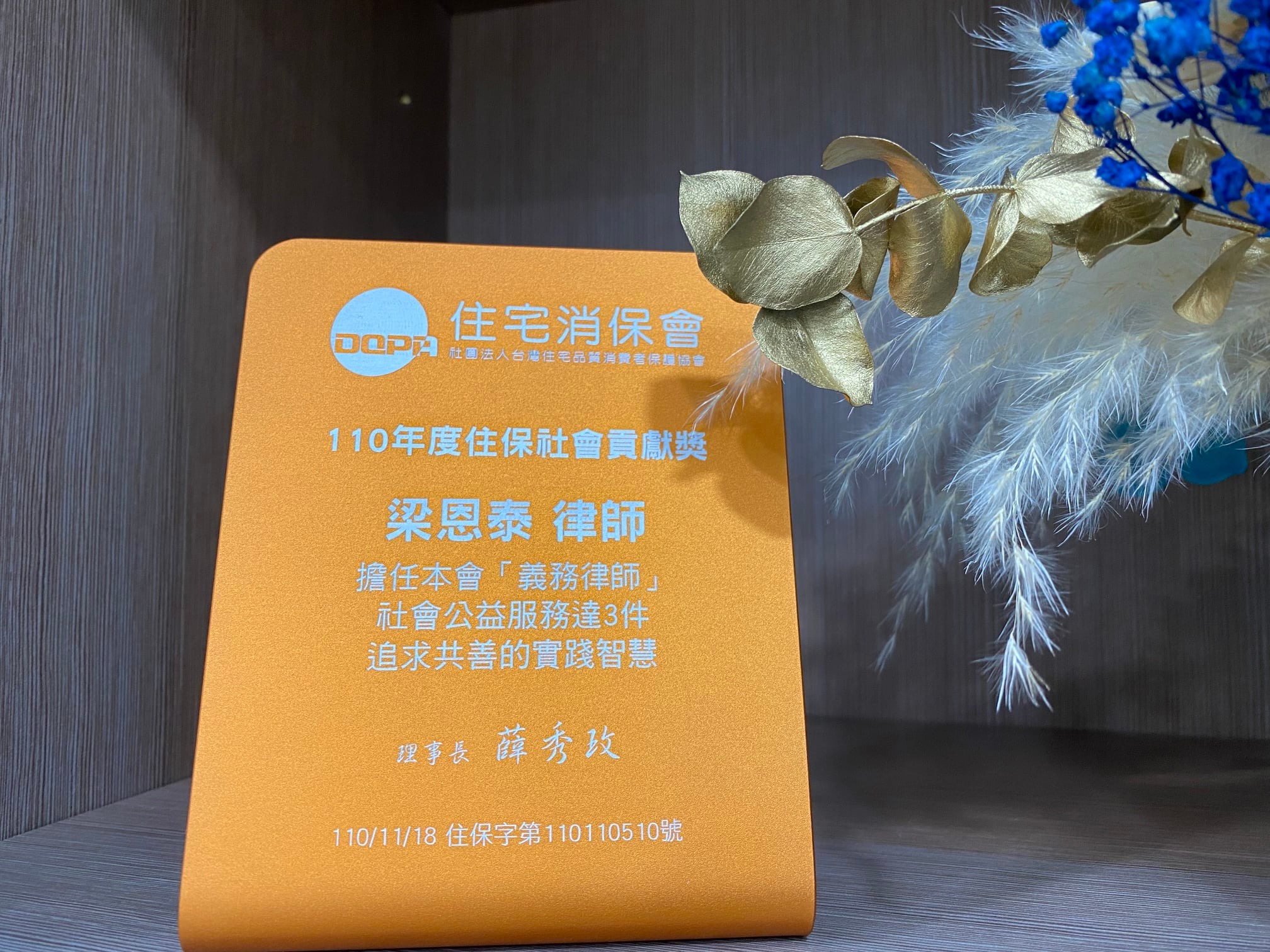 本事務所梁恩泰主持律師於2021年11月18日受到住宅消保會贈與「110年度住保社會貢獻獎」。