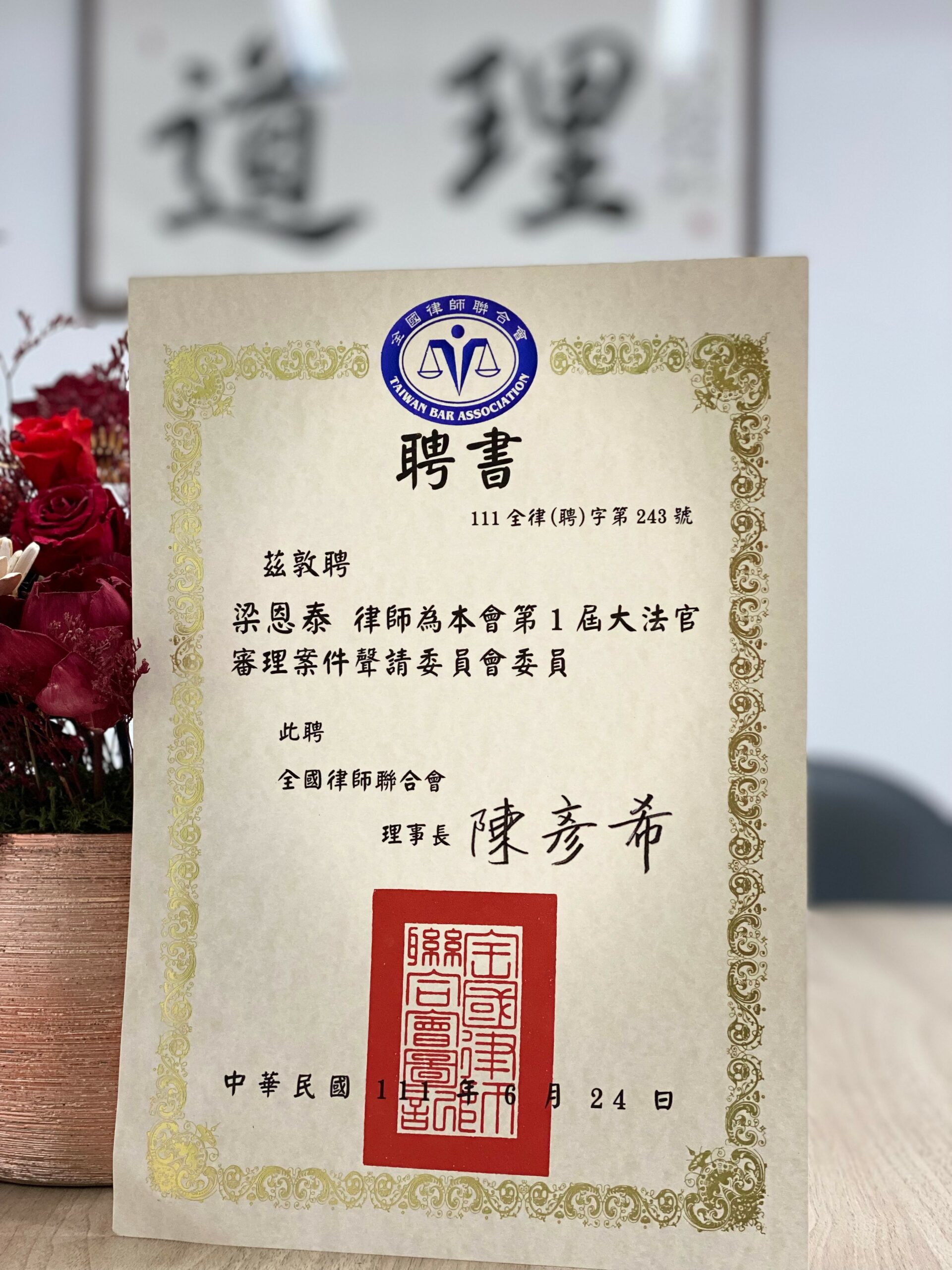 本所梁恩泰主持律師受全國律師聯合會榮聘為『第1屆大法官審理案件聲請委員會』委員